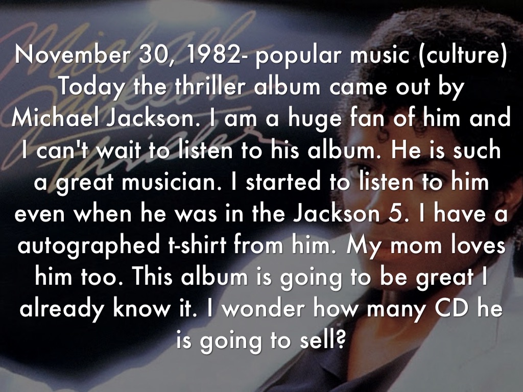 Today the thriller album came out by Michael Jackson. I am a huge fan of him and I can't wait to listen to his album. He is such a great musician. I started to listen to him even when he was in the Jackson 5. I have a autographed t-shirt from him. My mom loves him too. This album is going to be great I already know it. I wonder how many CD he is going to sell?