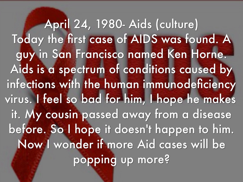 Today the first case of AIDS was found. A guy in San Francisco named Ken Horne. Aids is a spectrum of conditions caused by infections with the human immunodeficiency virus. I feel so bad for him, I hope he makes it. My cousin passed away from a disease before. So I hope it doesn't happen to him. Now I wonder if more Aid cases will be popping up more?