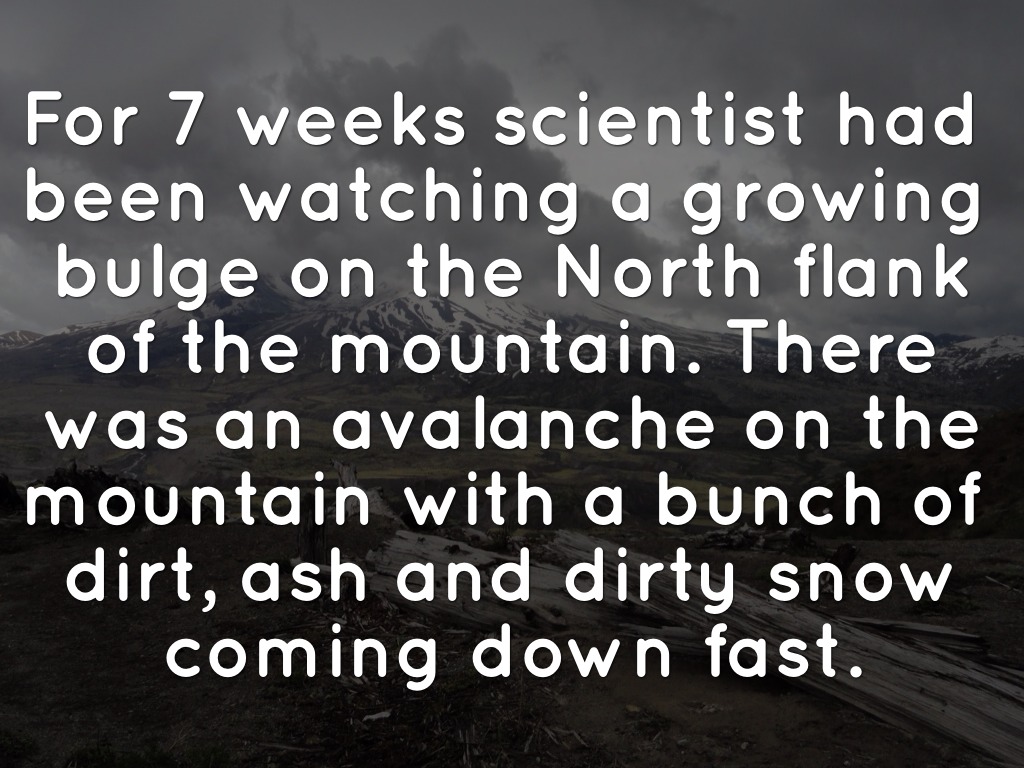 For 7 weeks scientist had been watching a growing bulge on the North flank of the mountain. There was an avalanche on the mountain with a bunch of dirt, ash and dirty snow coming down fast.