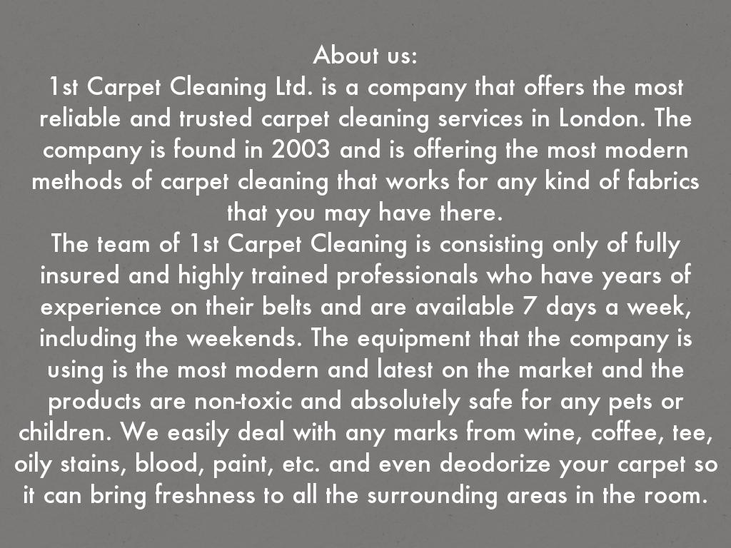 1st Carpet Cleaning Ltd. is a company that offers the most reliable and trusted carpet cleaning services in London. The company is found in 2003 and is offering the most modern methods of carpet cleaning that works for any kind of fabrics that you may have there.