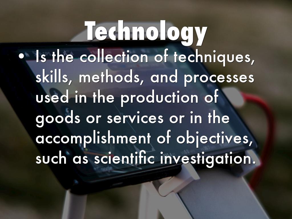 Is the collection of techniques, skills, methods, and processes used in the production of goods or services or in the accomplishment of objectives, such as scientific investigation.
