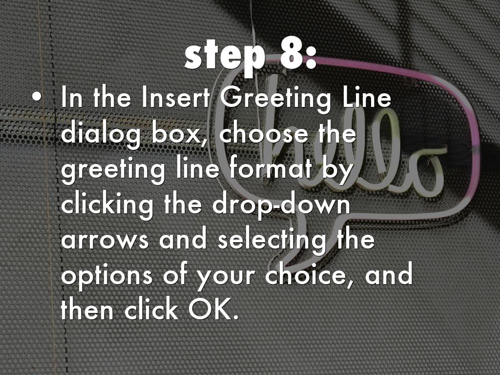 In the Insert Greeting Line dialog box, choose the greeting line format by clicking the drop-down arrows and selecting the options of your choice, and then click OK.