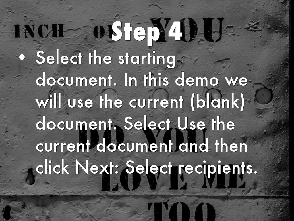 Select the starting document. In this demo we will use the current (blank) document. Select Use the current document and then click Next: Select recipients.