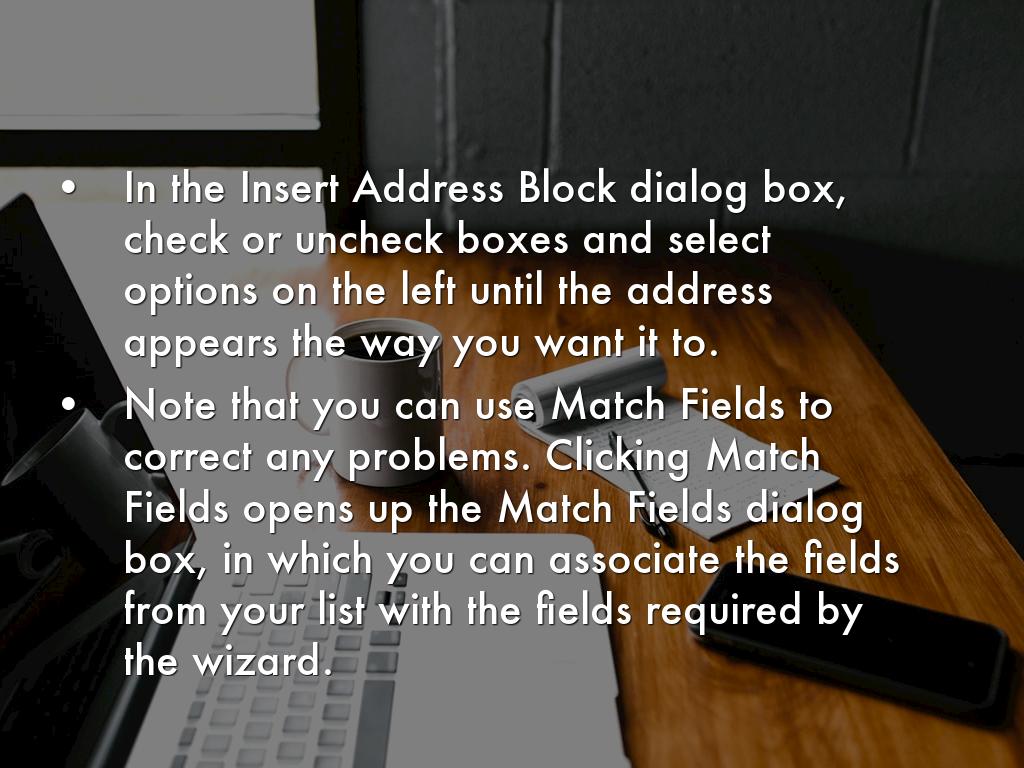 In the Insert Address Block dialog box, check or uncheck boxes and select options on the left until the address appears the way you want it to.