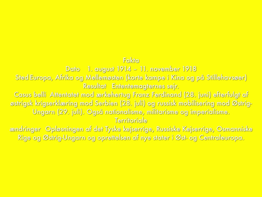 1. verdenskrig (oprindeligt Den store krig) var en global militær konflikt, der varede fra 1. august 1914 til 11. november 1918 og fandt sted på slagmarker mestendels i Europa, men også i Mellemøsten, Afrika og sporadisk i Sydøstasien. Krigen kostede over ni millioner menneskeliv og blev dermed en af de blodigste konflikter i verdenshistorien dengang.