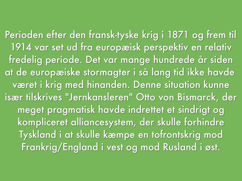 Perioden efter den fransk-tyske krig i 1871 og frem til 1914 var set ud fra europæisk perspektiv en relativ fredelig periode. Det var mange hundrede år siden at de europæiske stormagter i så lang tid ikke havde været i krig med hinanden. Denne situation kunne især tilskrives "Jernkansleren" Otto von Bismarck, der meget pragmatisk havde indrettet et sindrigt og kompliceret alliancesystem, der skulle forhindre Tyskland i at skulle kæmpe en tofrontskrig mod Frankrig/England i vest og mod Rusland i øst.