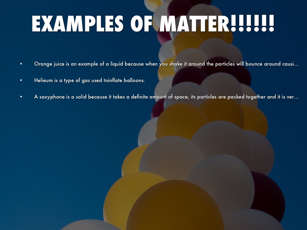 • Orange juice is an example of a liquid because when you shake it around the particles will bounce around causing the liquid to bounde and make a mess.