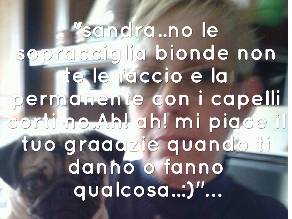 "sandra..no le sopracciglia bionde non te le faccio e la permanente con i capelli corti no.Ah! ah! mi piace il tuo graaazie quando ti danno o fanno qualcosa..:)"