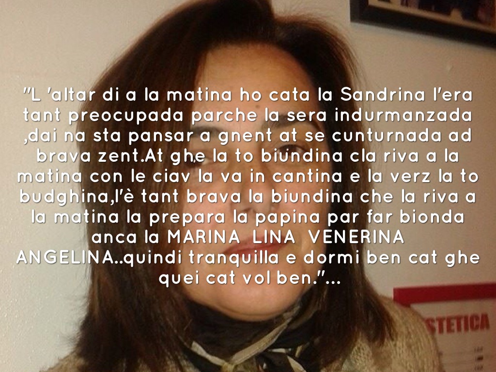 "L 'altar di a la matina ho cata la Sandrina l'era tant preocupada parche la sera indurmanzada ,dai na sta pansar a gnent at se cunturnada ad brava zent.At ghe la to biundina cla riva a la matina con le ciav la va in cantina e la verz la to budghina,l'è tant brava la biundina che la riva a la matina la prepara la papina par far bionda anca la MARINA LINA VENERINA ANGELINA..quindi tranquilla e dormi ben cat ghe quei cat vol ben."