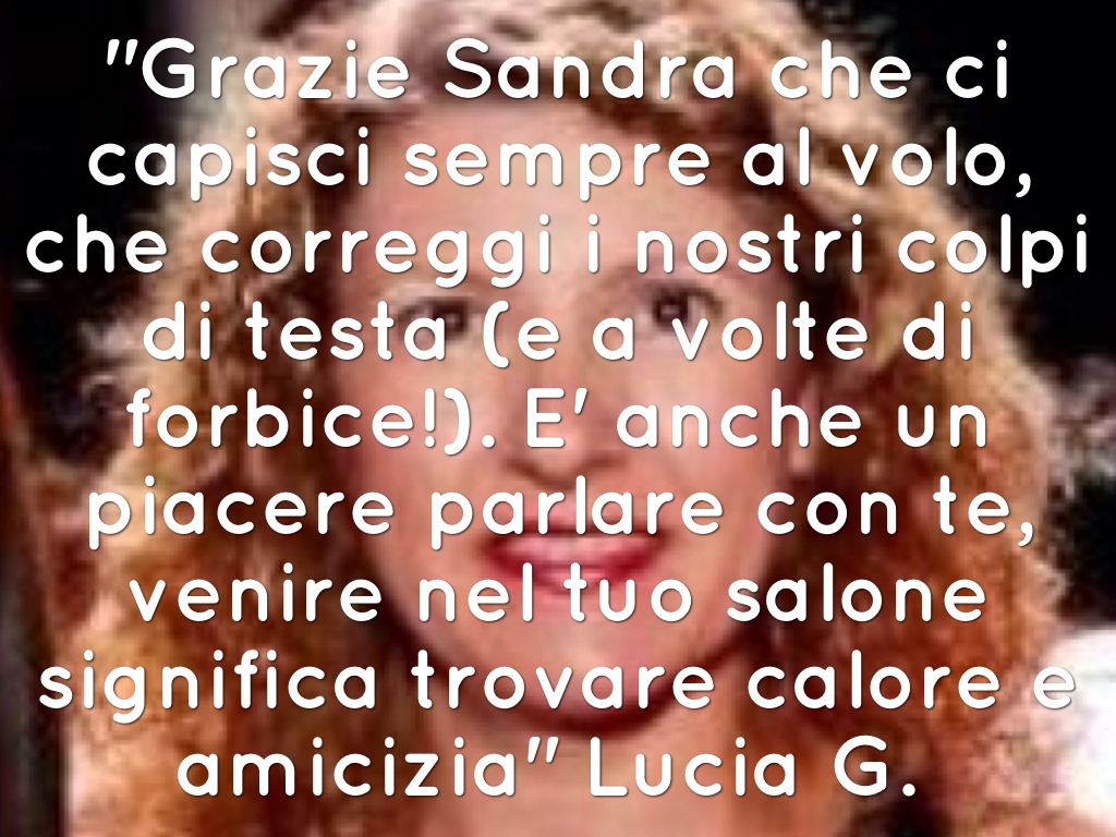 "Grazie Sandra che ci capisci sempre al volo, che correggi i nostri colpi di testa (e a volte di forbice!). E' anche un piacere parlare con te, venire nel tuo salone significa trovare calore e amicizia" Lucia G.