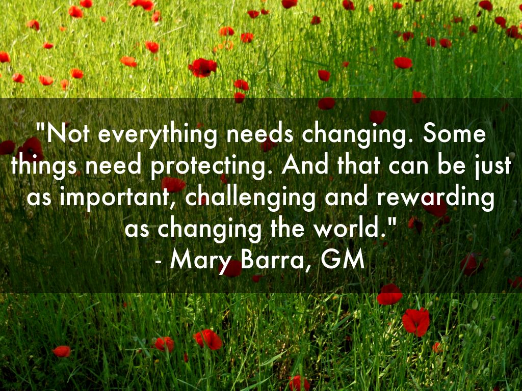"Not everything needs changing. Some things need protecting. And that can be just as important, challenging and rewarding as changing the world." - Mary Barra, GM