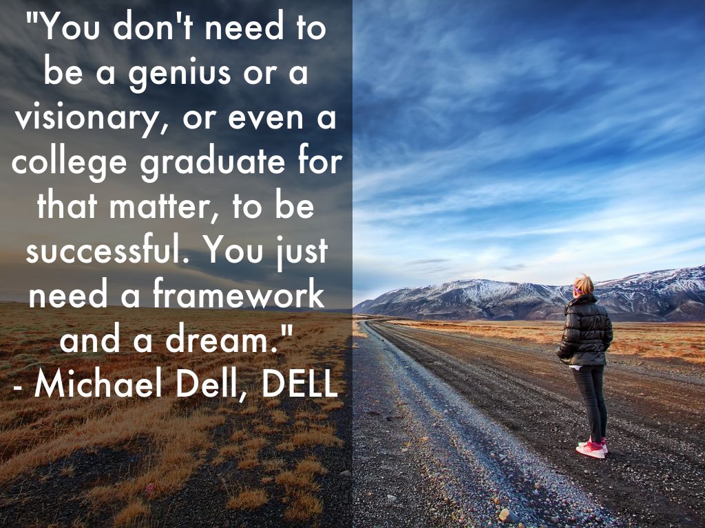 "You don't need to be a genius or a visionary, or even a college graduate for that matter, to be successful. You just need a framework and a dream." - Michael Dell, DELL