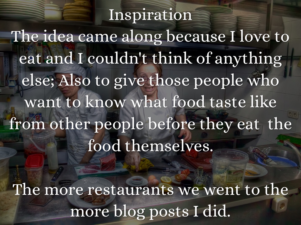 Inspiration The idea came along because I love to eat and I couldn't think of anything else; Also to give those people who want to know what food taste like from other people before they eat the food themselves.