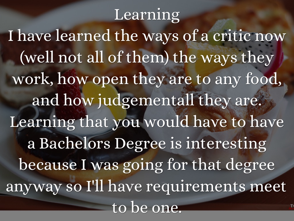 Learning I have learned the ways of a critic now (well not all of them) the ways they work, how open they are to any food, and how judgementall they are. Learning that you would have to have a Bachelors Degree is interesting because I was going for that degree anyway so I'll have requirements meet to be one.