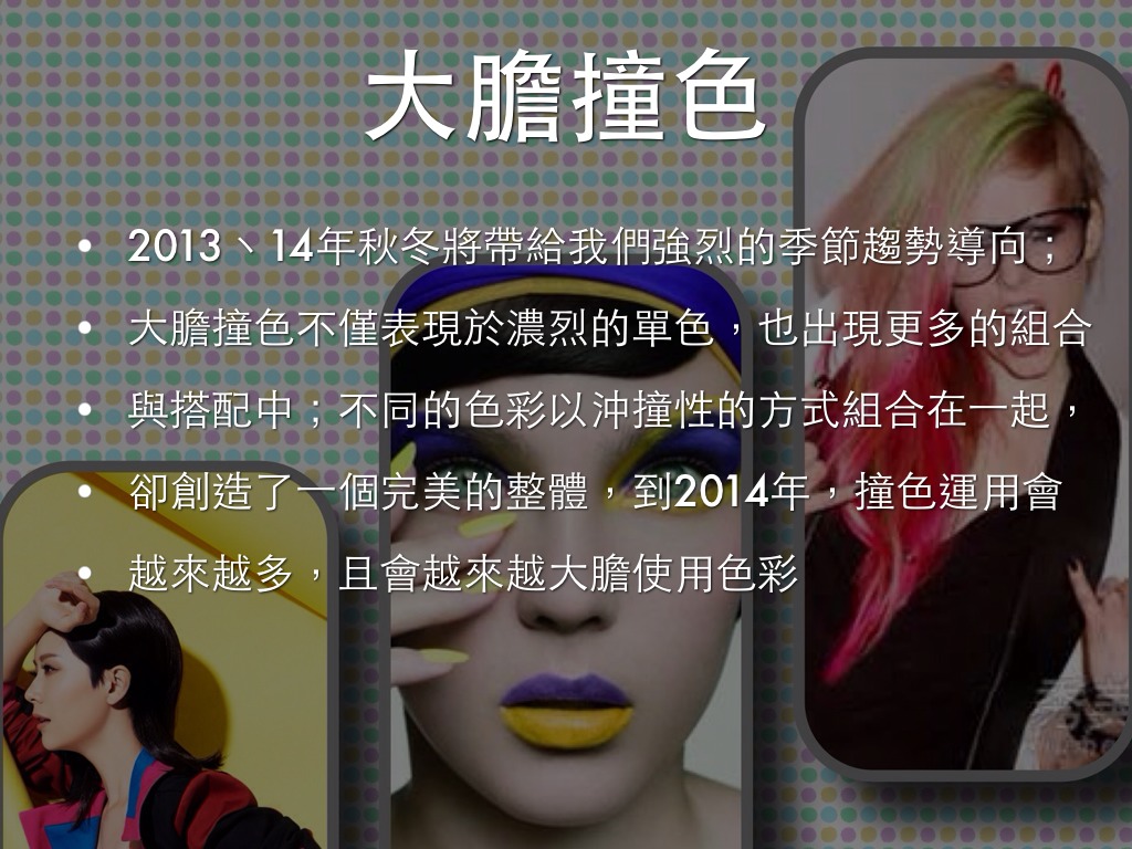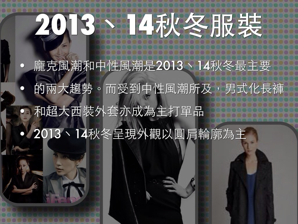 2013丶14年流行元素有:圓點丶鉚釘丶圖騰丶墊肩丶色塊及皮革