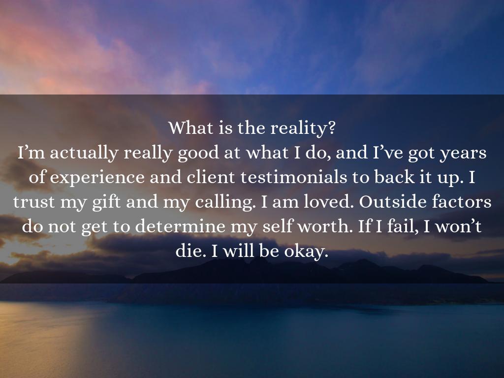 I’m actually really good at what I do, and I’ve got years of experience and client testimonials to back it up. I trust my gift and my calling. I am loved. Outside factors do not get to determine my self worth. If I fail, I won’t die. I will be okay.