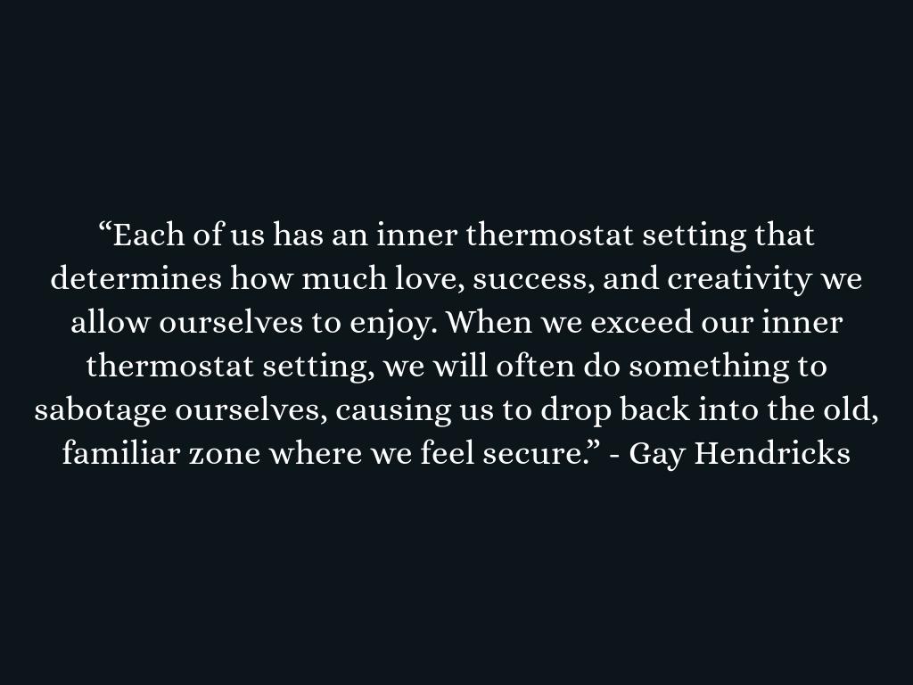 “Each of us has an inner thermostat setting that determines how much love, success, and creativity we allow ourselves to enjoy. When we exceed our inner thermostat setting, we will often do something to sabotage ourselves, causing us to drop back into the old, familiar zone where we feel secure.” - Gay Hendricks