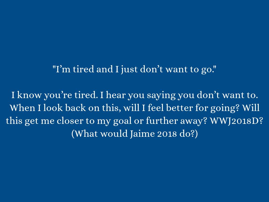 I know you’re tired. I hear you saying you don’t want to. When I look back on this, will I feel better for going? Will this get me closer to my goal or further away? WWJ2018D? (What would Jaime 2018 do?)