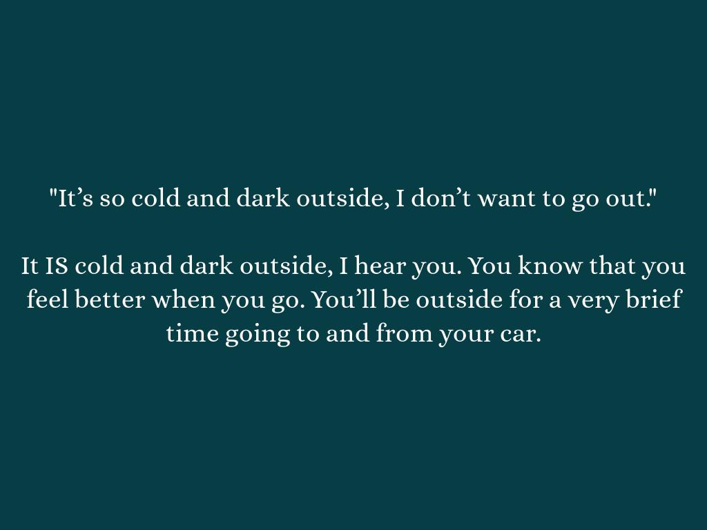 It IS cold and dark outside, I hear you. You know that you feel better when you go. You’ll be outside for a very brief time going to and from your car.