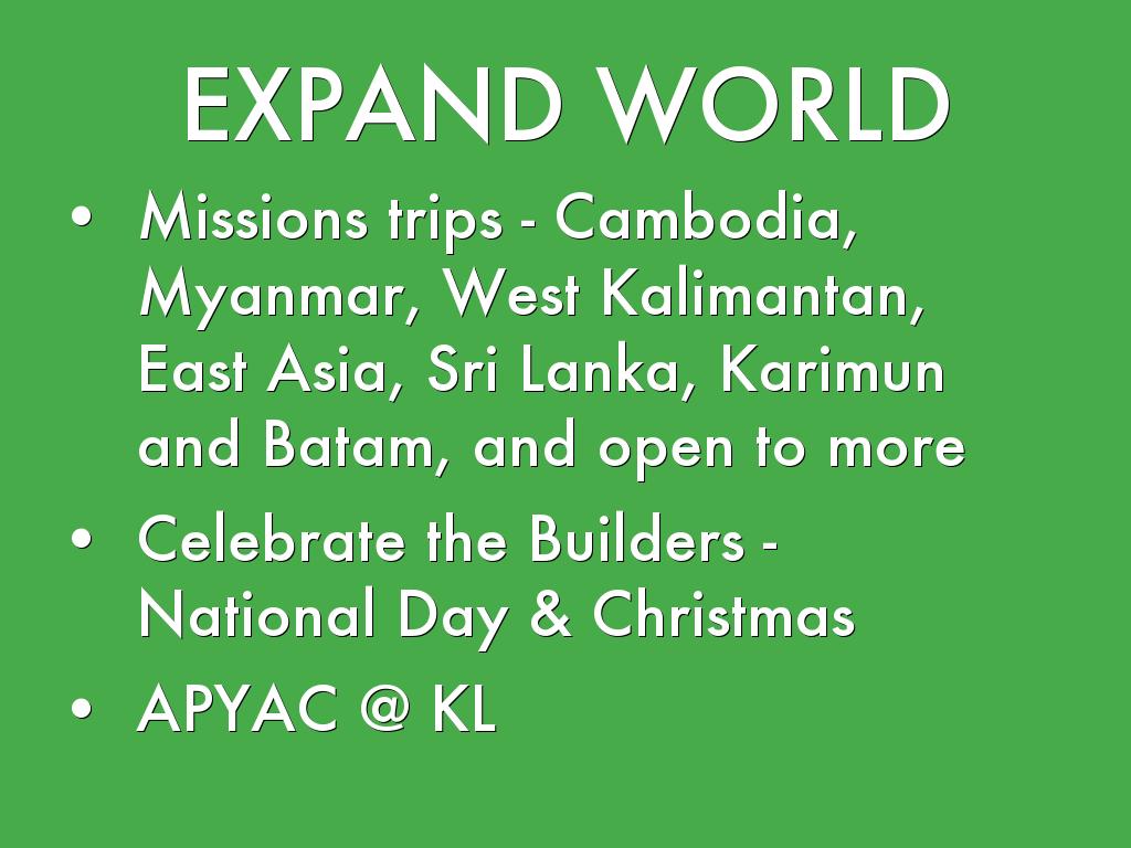 Missions trips - Cambodia, Myanmar, West Kalimantan, East Asia, Sri Lanka, Karimun and Batam, and open to more