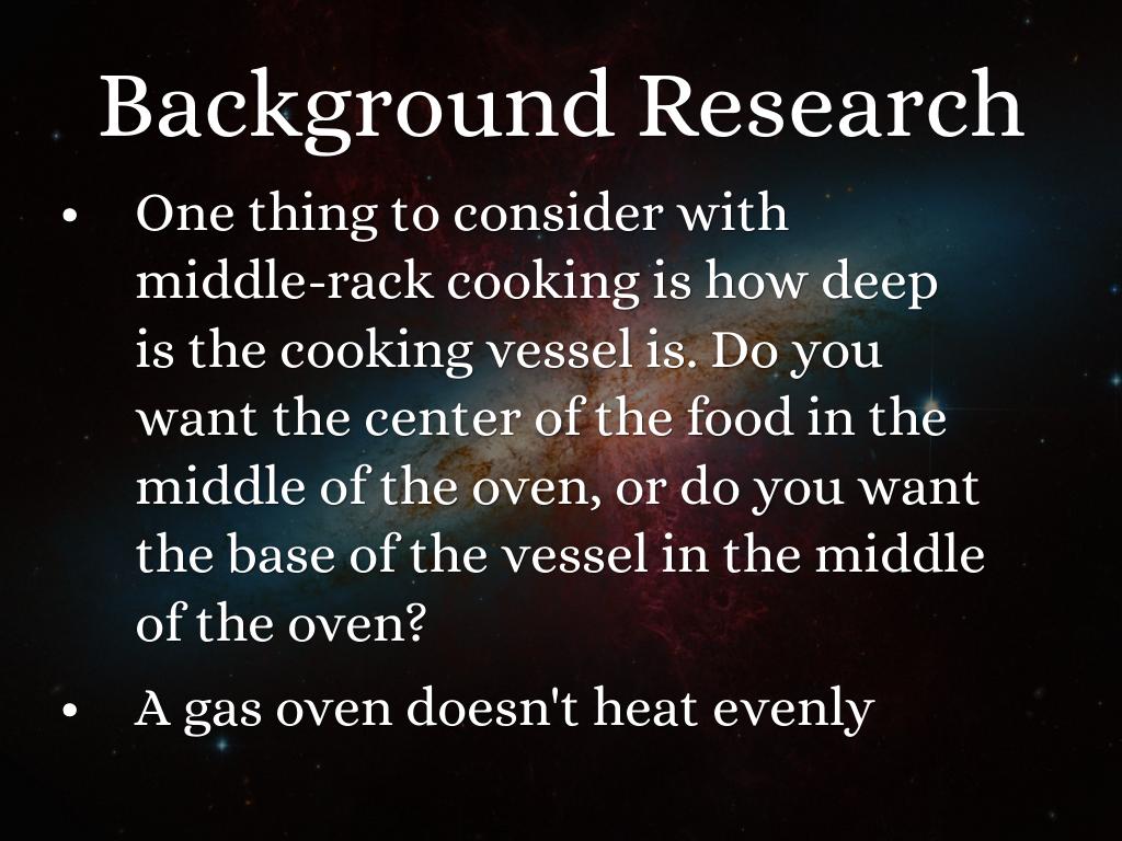 One thing to consider with middle-rack cooking is how deep is the cooking vessel is. Do you want the center of the food in the middle of the oven, or do you want the base of the vessel in the middle of the oven?