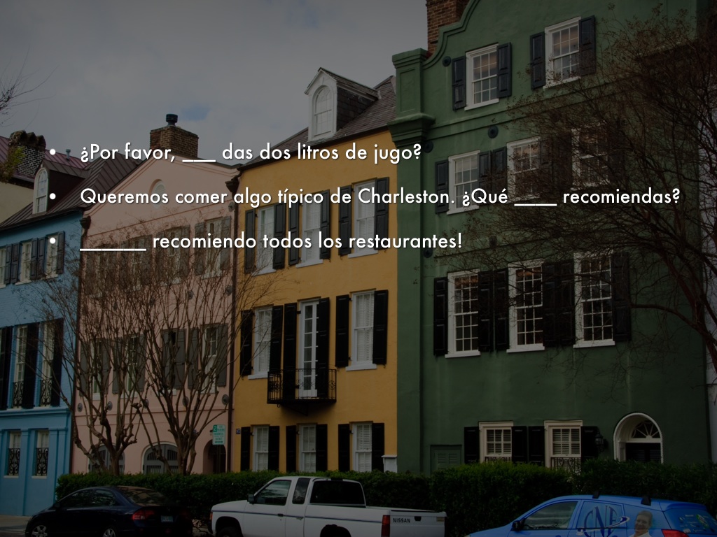 Queremos comer algo típico de Charleston. ¿Qué ____ recomiendas?