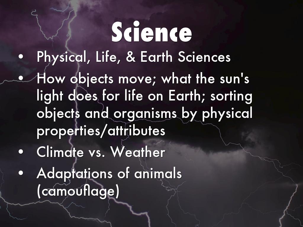 How objects move; what the sun's light does for life on Earth; sorting objects and organisms by physical properties/attributes