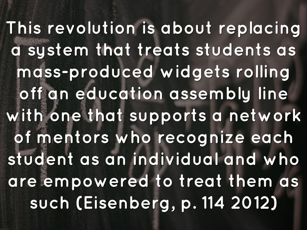 This revolution is about replacing a system that treats students as mass-produced widgets rolling off an education assembly line with one that supports a network of mentors who recognize each student as an individual and who are empowered to treat them as such (Eisenberg, p. 114 2012)