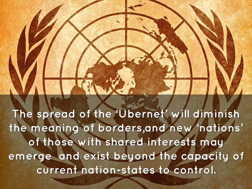 The spread of the ‘Ubernet’ will diminish the meaning of borders,and new ‘nations’ of those with shared interests may emerge and exist beyond the capacity of current nation-states to control.