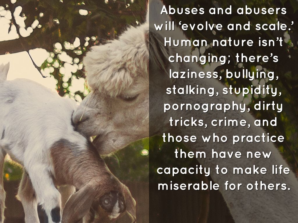 Abuses and abusers will ‘evolve and scale.’ Human nature isn’t changing; there’s laziness, bullying, stalking, stupidity, pornography, dirty tricks, crime, and those who practice them have new capacity to make life miserable for others.