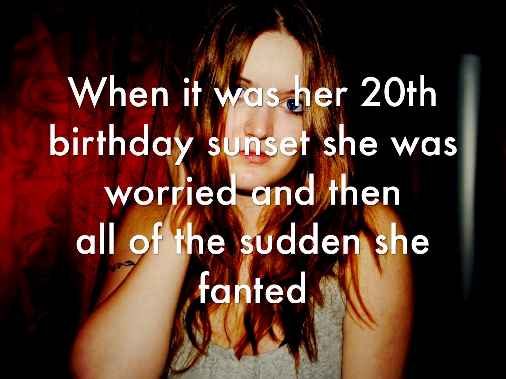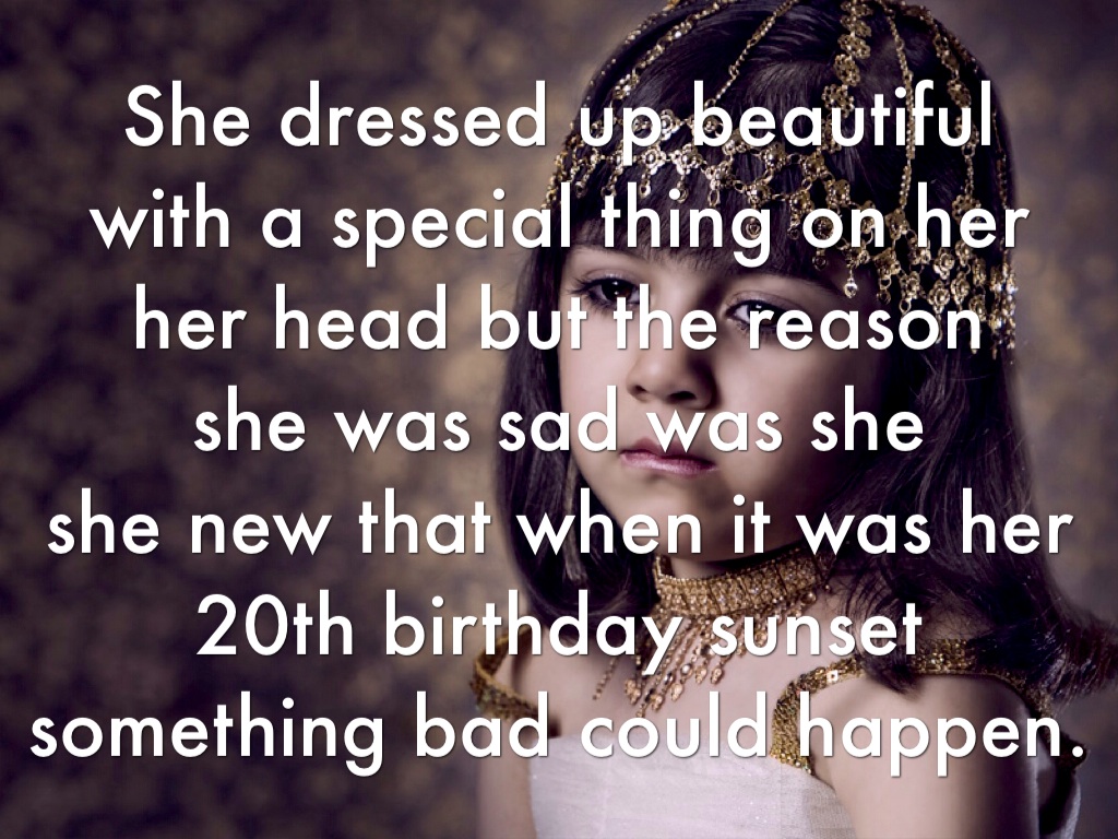 She dressed up beautiful with a special thing on her her head but the reason she was sad was she she new that when it was her 20th birthday sunset something bad could happen.