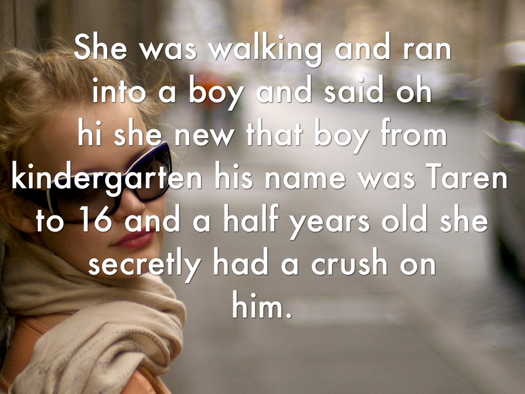 She was walking and ran into a boy and said oh hi she new that boy from kindergarten his name was Taren to 16 and a half years old she secretly had a crush on him.