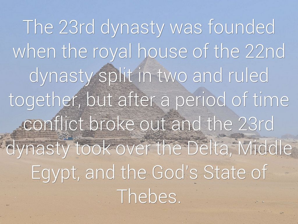The 23rd dynasty was founded when the royal house of the 22nd dynasty split in two and ruled together, but after a period of time conflict broke out and the 23rd dynasty took over the Delta, Middle Egypt, and the God's State of Thebes.