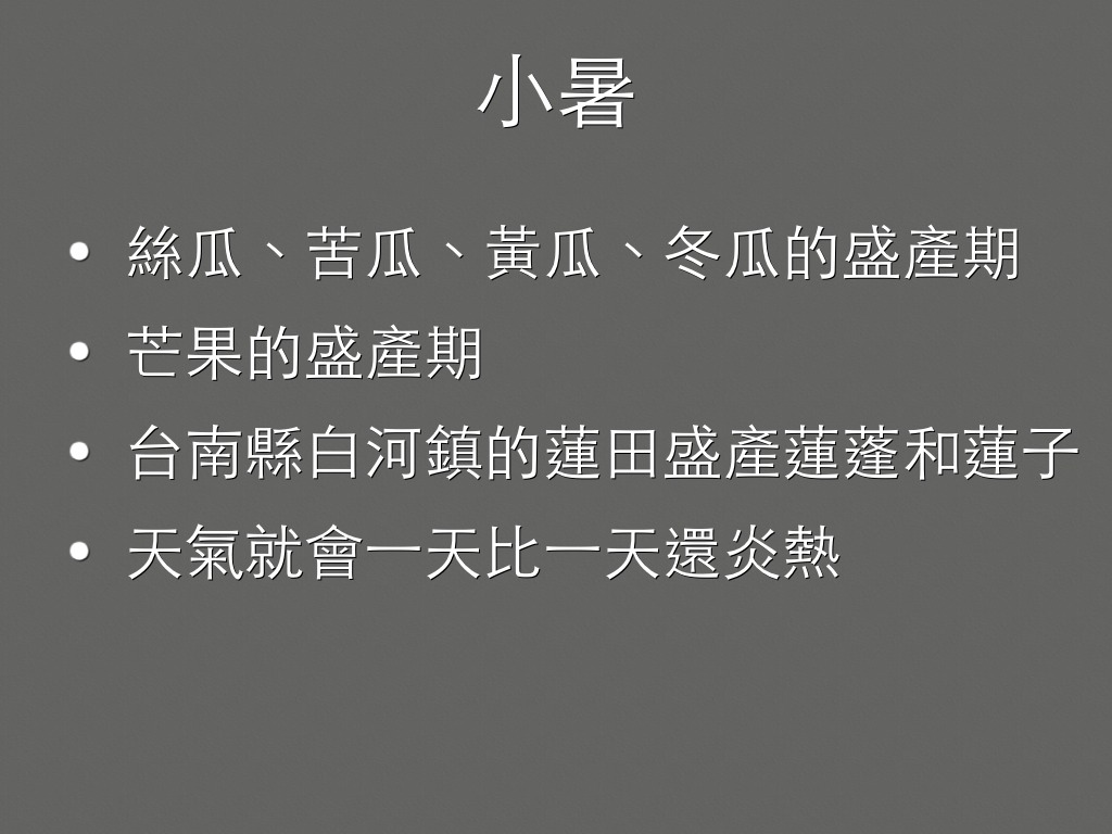 • 絲瓜、苦瓜、黃瓜、冬瓜的盛產期