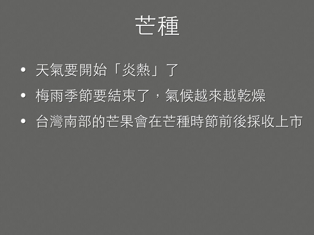 • 台灣南部的芒果會在芒種時節前後採收上市