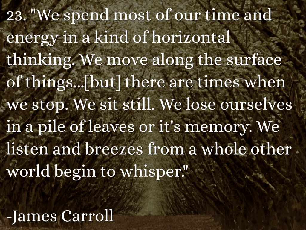 23. "We spend most of our time and energy in a kind of horizontal thinking. We move along the surface of things...[but] there are times when we stop. We sit still. We lose ourselves in a pile of leaves or it's memory. We listen and breezes from a whole other world begin to whisper."
