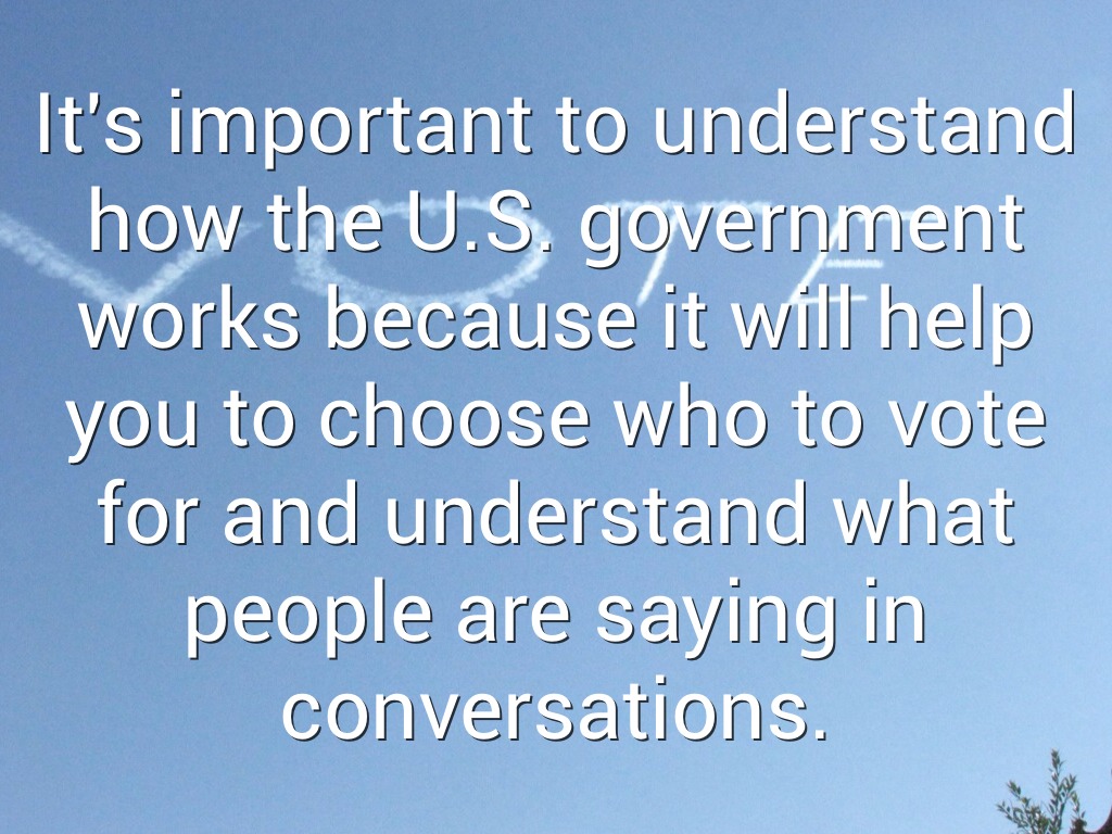 It's important to understand how the U.S. government works because it will help you to choose who to vote for and understand what people are saying in conversations.