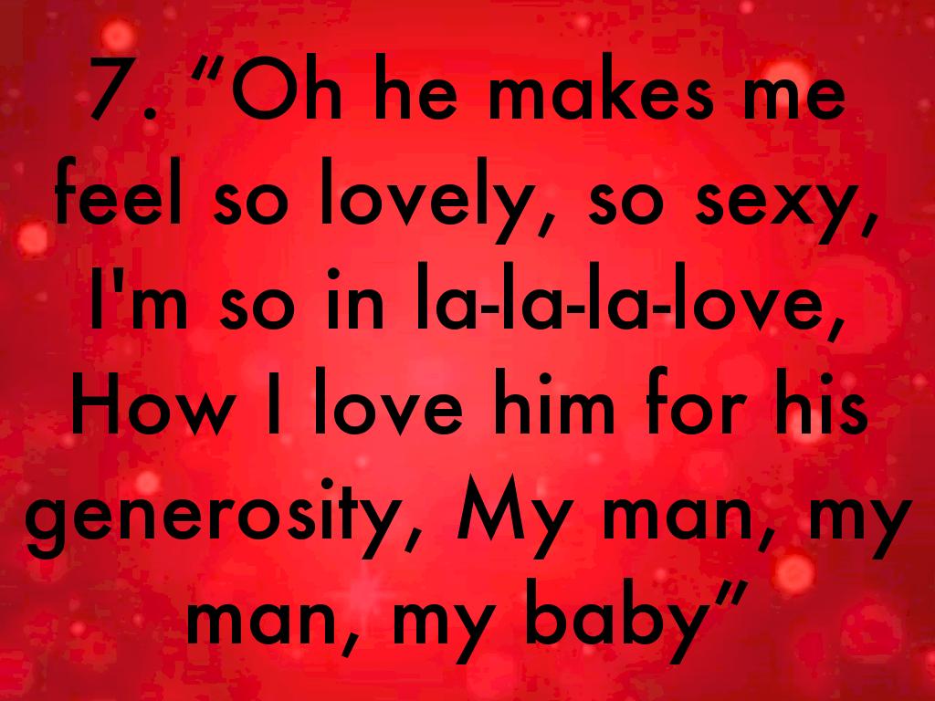 7. “Oh he makes me feel so lovely, so sexy, I'm so in la-la-la-love, How I love him for his generosity, My man, my man, my baby”