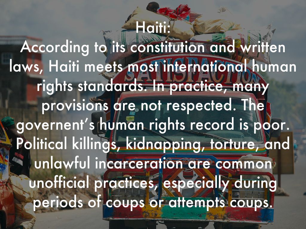 Haiti: According to its constitution and written laws, Haiti meets most international human rights standards. In practice, many provisions are not respected. The governent’s human rights record is poor. Political killings, kidnapping, torture, and unlawful incarceration are common unofficial practices, especially during periods of coups or attempts coups.
