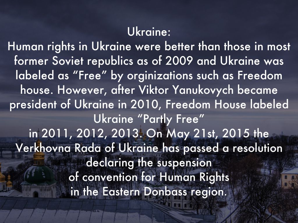 Ukraine: Human rights in Ukraine were better than those in most former Soviet republics as of 2009 and Ukraine was labeled as “Free” by orginizations such as Freedom house. However, after Viktor Yanukovych became president of Ukraine in 2010, Freedom House labeled Ukraine “Partly Free” in 2011, 2012, 2013. On May 21st, 2015 the Verkhovna Rada of Ukraine has passed a resolution declaring the suspension of convention for Human Rights in the Eastern Donbass region.