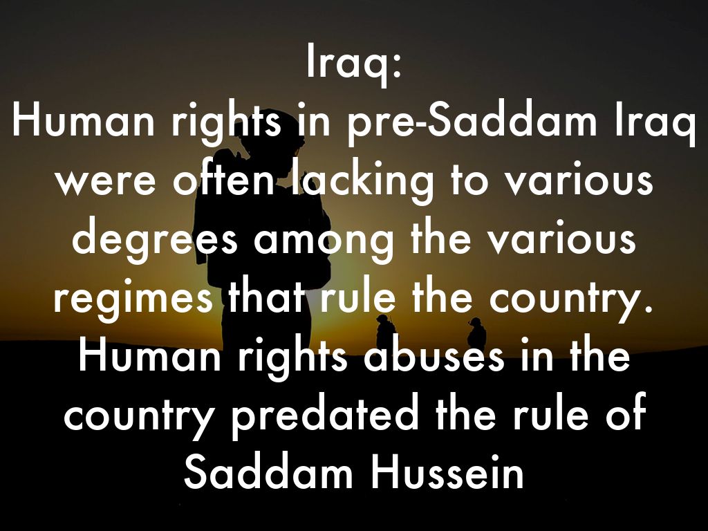 Iraq: Human rights in pre-Saddam Iraq were often lacking to various degrees among the various regimes that rule the country. Human rights abuses in the country predated the rule of Saddam Hussein