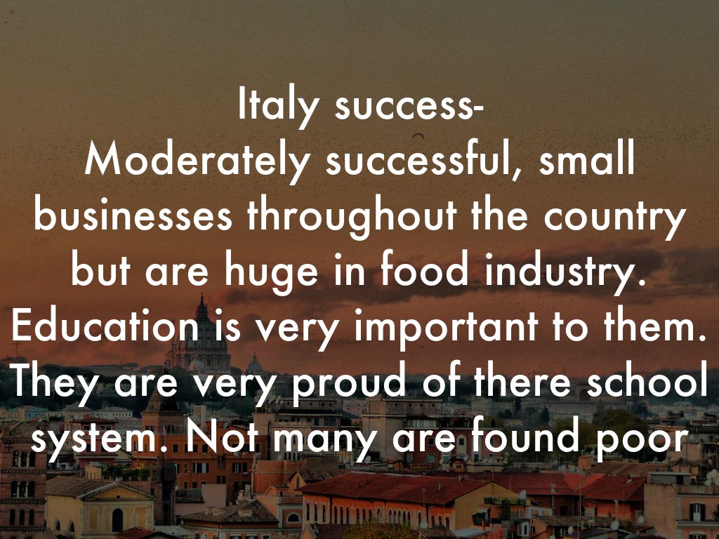 Moderately successful, small businesses throughout the country but are huge in food industry. Education is very important to them. They are very proud of there school system. Not many are found poor