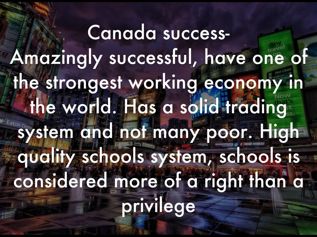 Amazingly successful, have one of the strongest working economy in the world. Has a solid trading system and not many poor. High quality schools system, schools is considered more of a right than a privilege