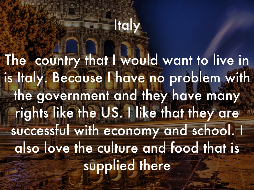 The country that I would want to live in is Italy. Because I have no problem with the government and they have many rights like the US. I like that they are successful with economy and school. I also love the culture and food that is supplied there