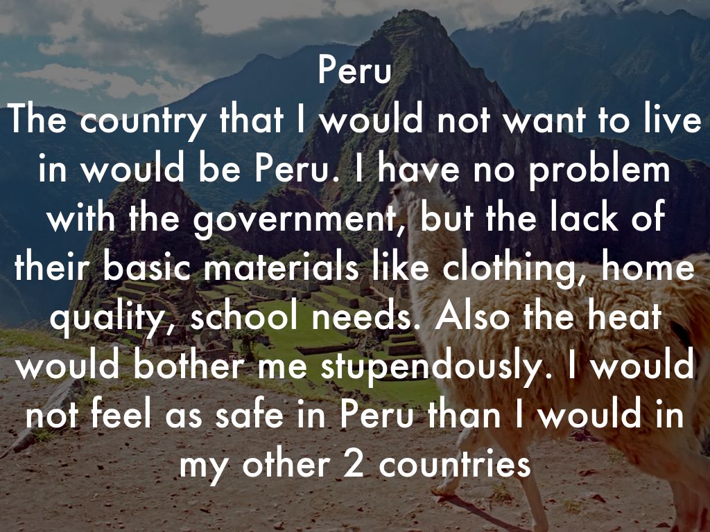 The country that I would not want to live in would be Peru. I have no problem with the government, but the lack of their basic materials like clothing, home quality, school needs. Also the heat would bother me stupendously. I would not feel as safe in Peru than I would in my other 2 countries