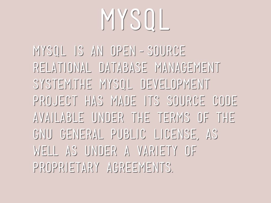 MySQL is an open-source relational database management system.The MySQL development project has made its source code available under the terms of the GNU General Public License, as well as under a variety of proprietary agreements.