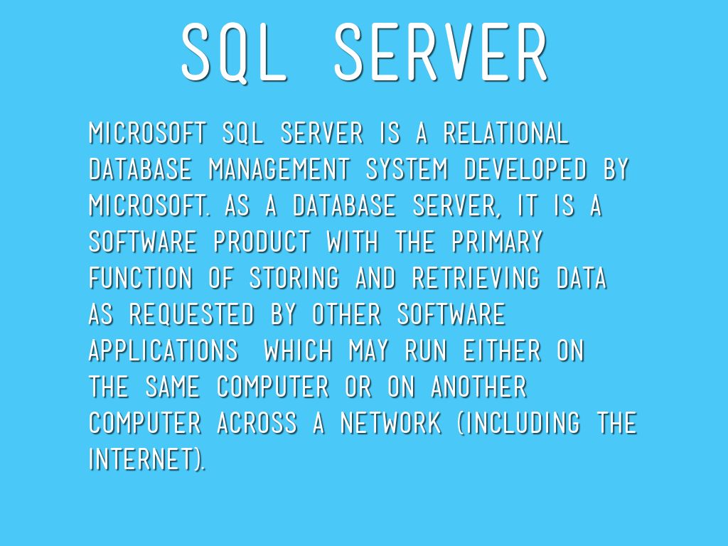 Microsoft SQL Server is a relational database management system developed by Microsoft. As a database server, it is a software product with the primary function of storing and retrieving data as requested by other software applications—which may run either on the same computer or on another computer across a network (including the Internet).