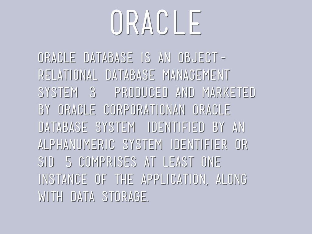 Oracle Database is an object-relational database management system[3] produced and marketed by Oracle CorporationAn Oracle database system—identified by an alphanumeric system identifier or SID[5 comprises at least one instance of the application, along with data storage.