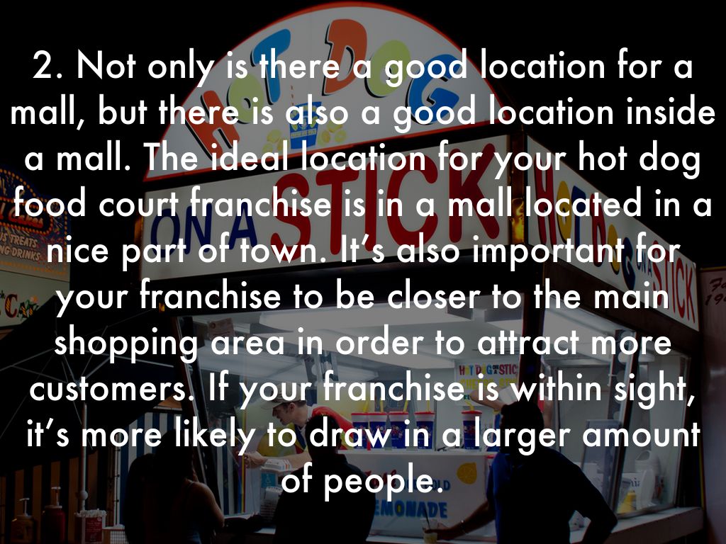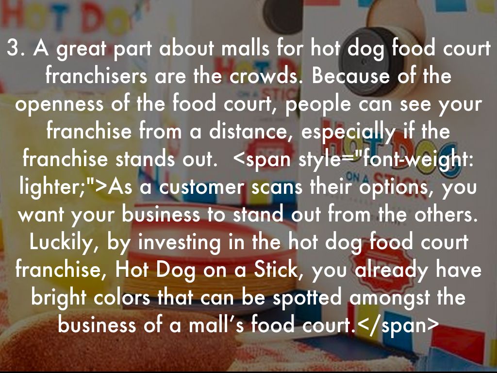 3. A great part about malls for hot dog food court franchisers are the crowds. Because of the openness of the food court, people can see your franchise from a distance, especially if the franchise stands out.