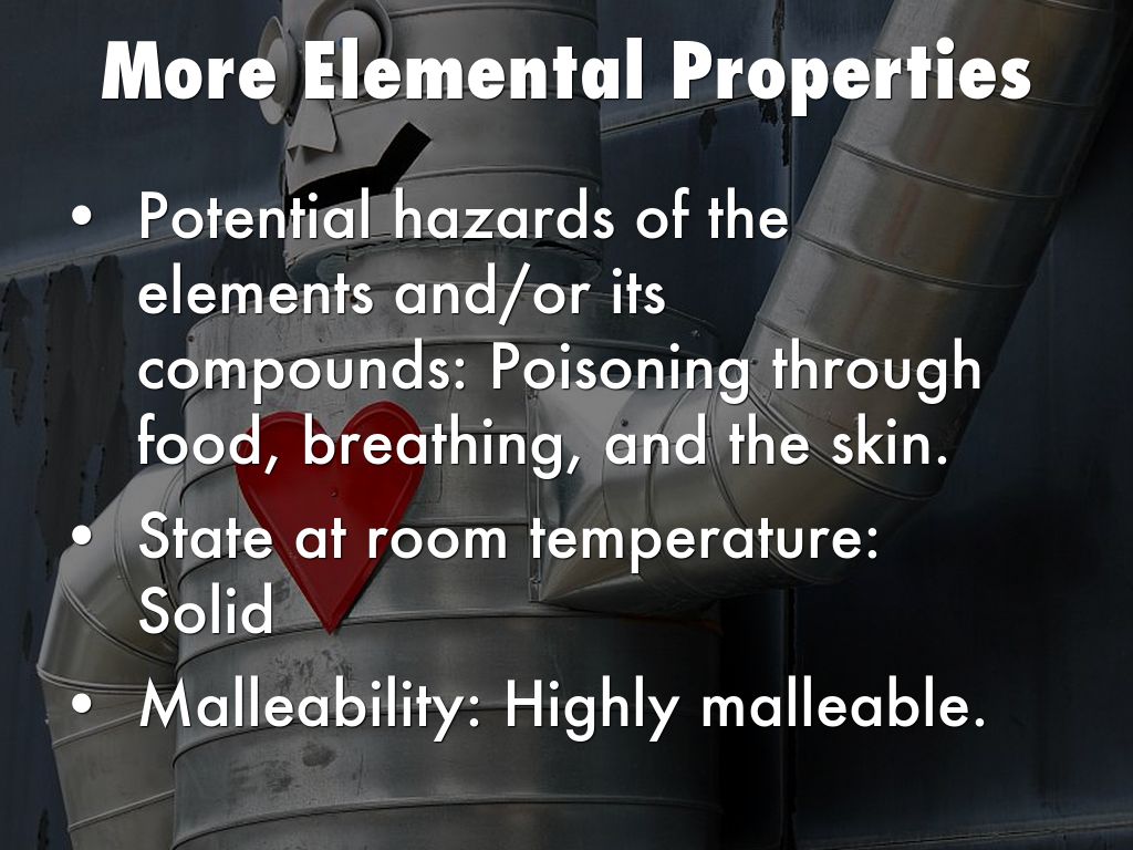 Potential hazards of the elements and/or its compounds: Poisoning through food, breathing, and the skin.